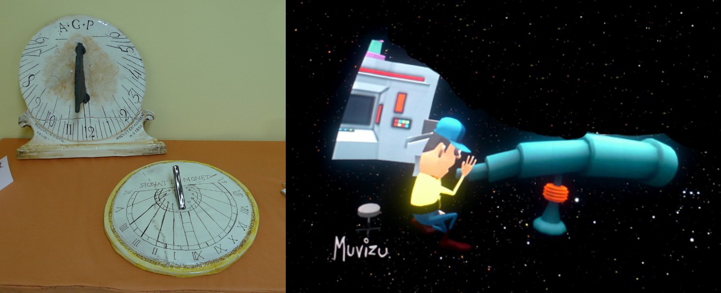L’immagine mostra alcune delle meridiane ricostruite ed esposte nel percorso museale (allestito nel Planetario da gennaio 2019) e un immagine da uno spettacolo del Planetario.